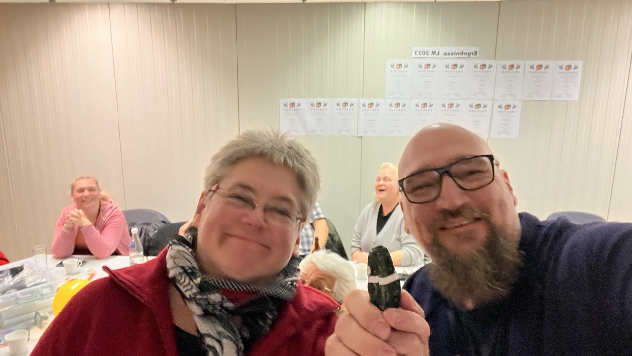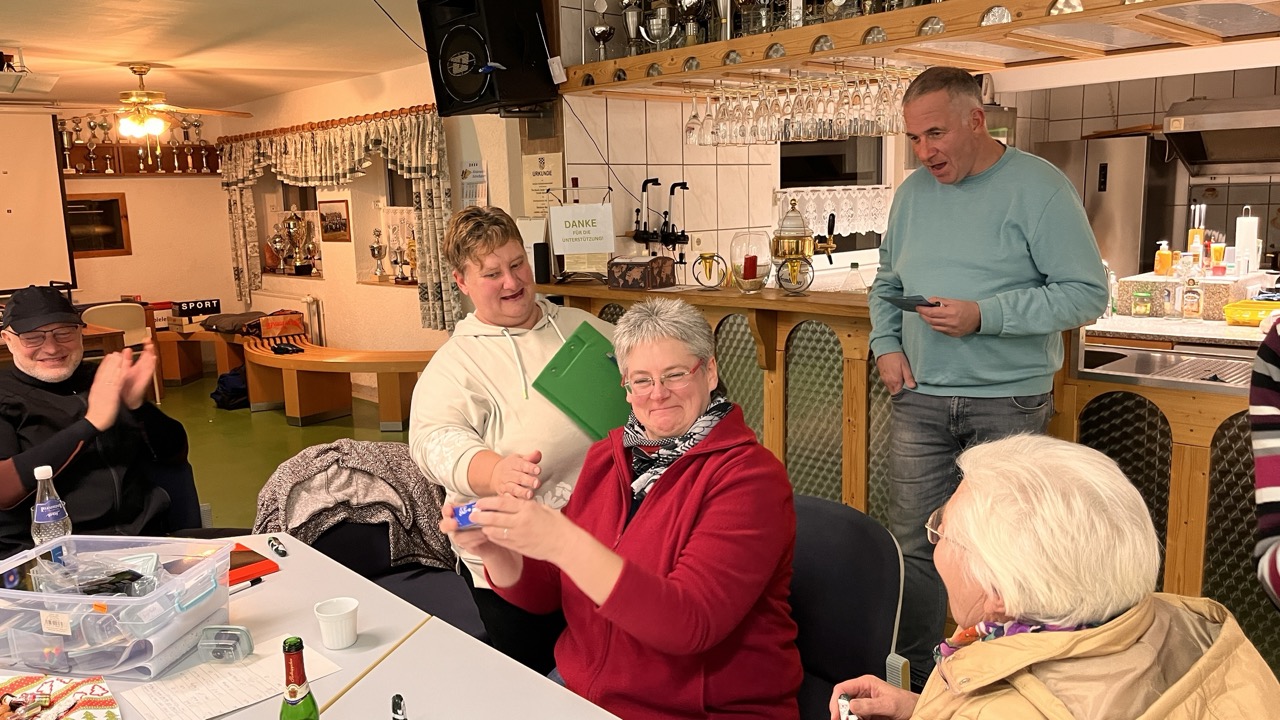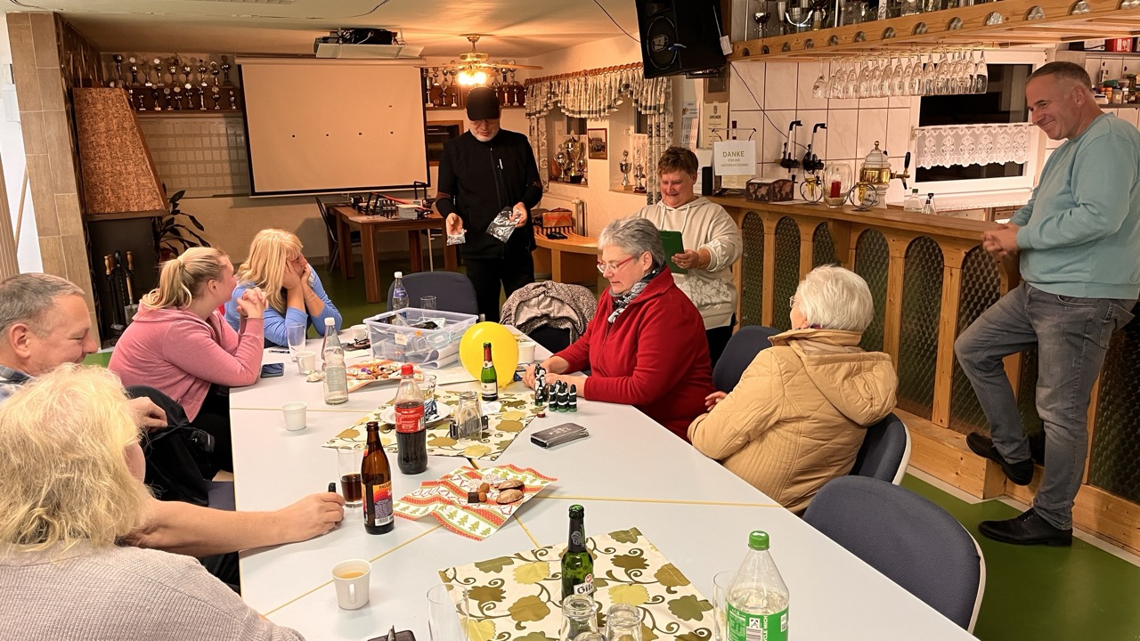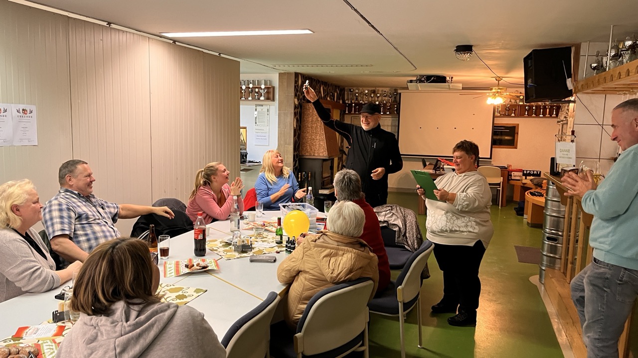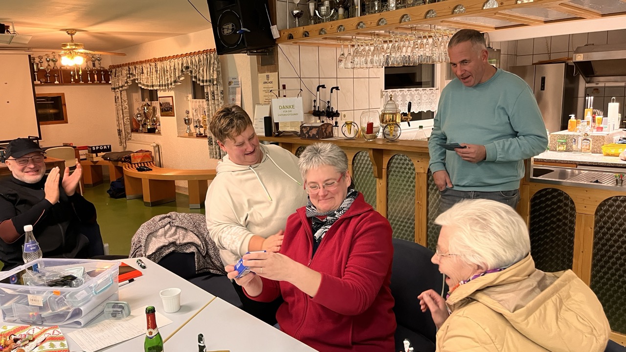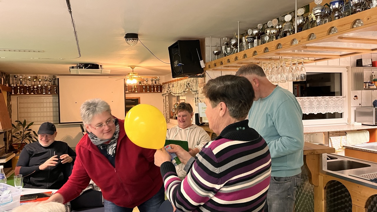 Die Gesamtsiegerin des Abends wurde Dagmar. Gewonnen hat sie eine Butterfahrt (ein leckeres Stück Butter). Der zweite Platz ging an Christa - eine Ballonfahrt (Luftballon mit Lippenpflege). Dritte wurde Sarah, sie gewann ein Essen für zwei Personen (Tütensuppe) und der vierte Platz ging an Uwe - eine Wellness-Behandlung (Gesichtsmaske). Alle anderen haben eine kleine Süßigkeit gewonnen, es ist also niemand leer ausgegangen.