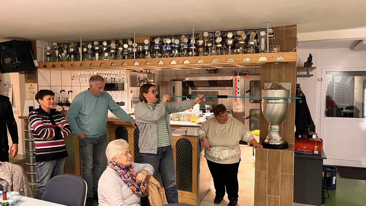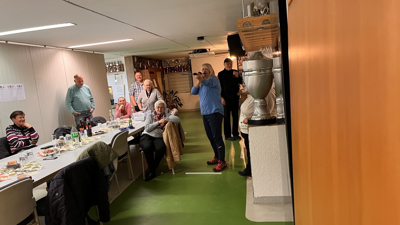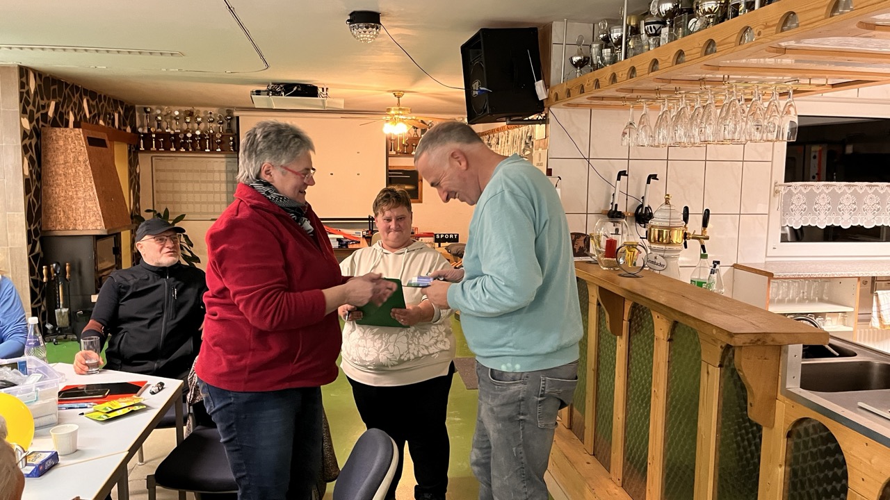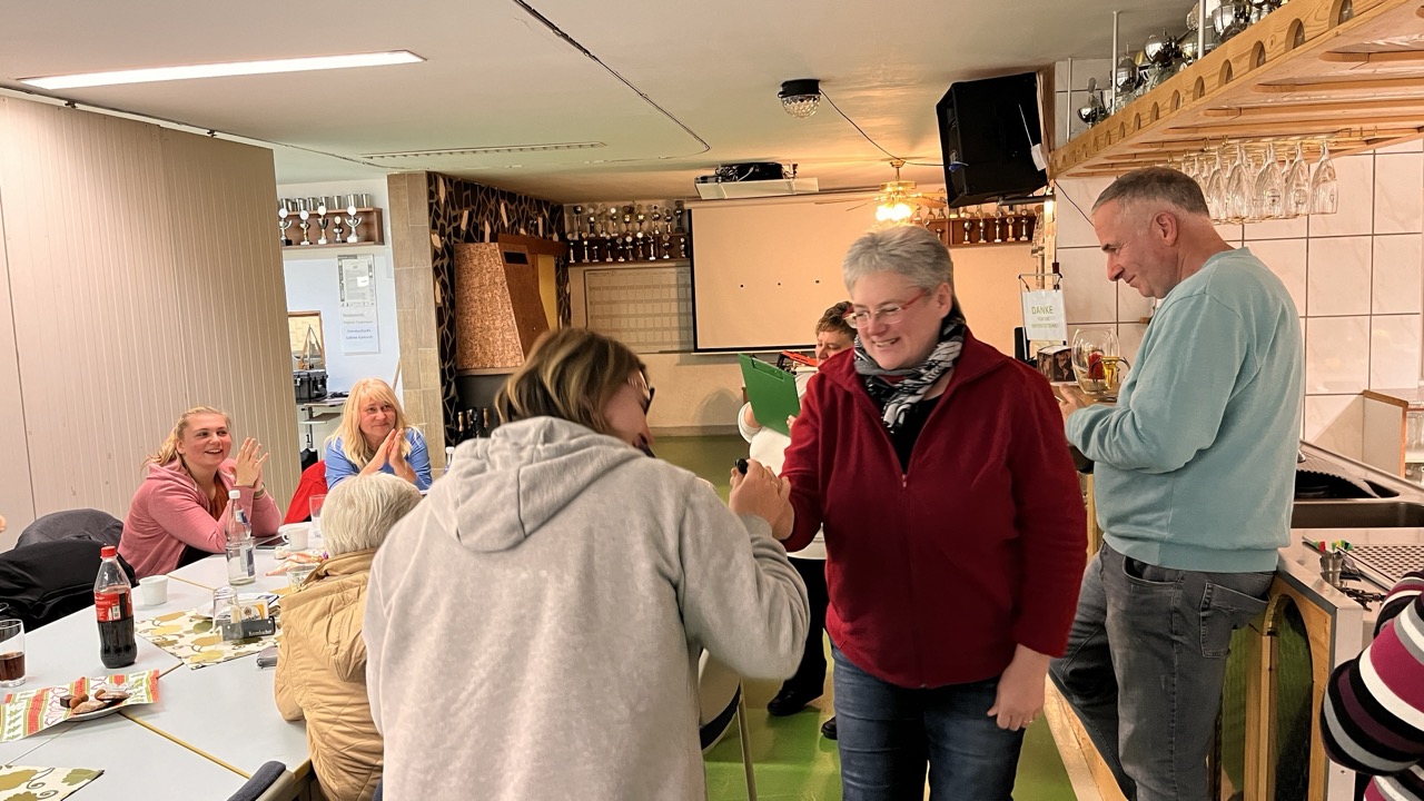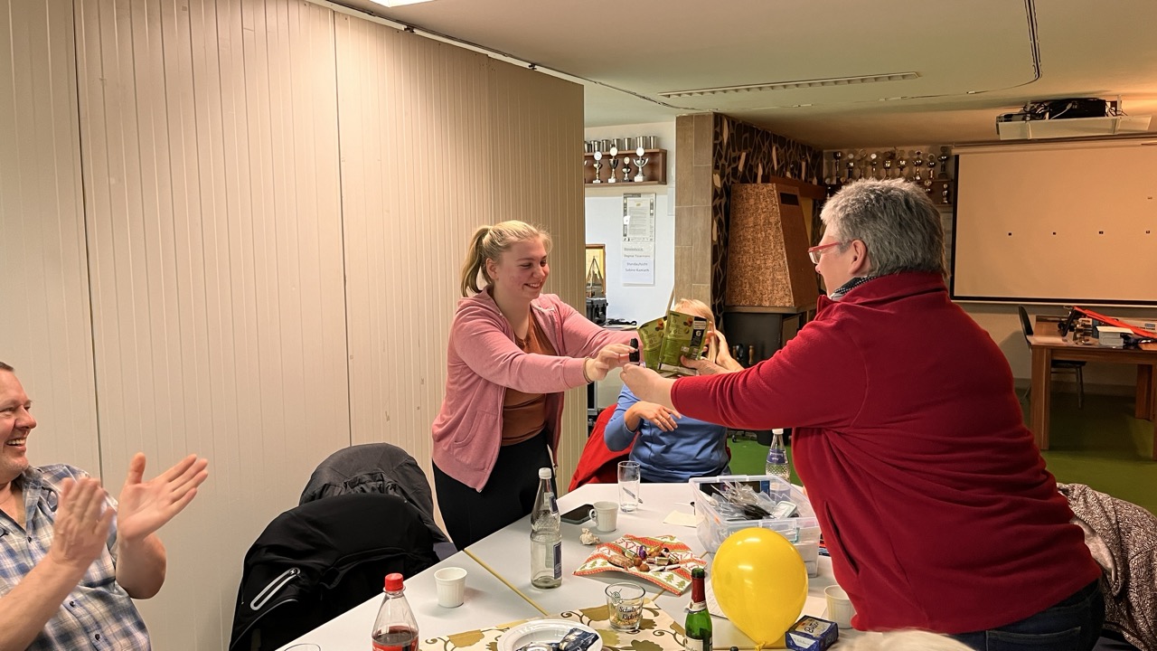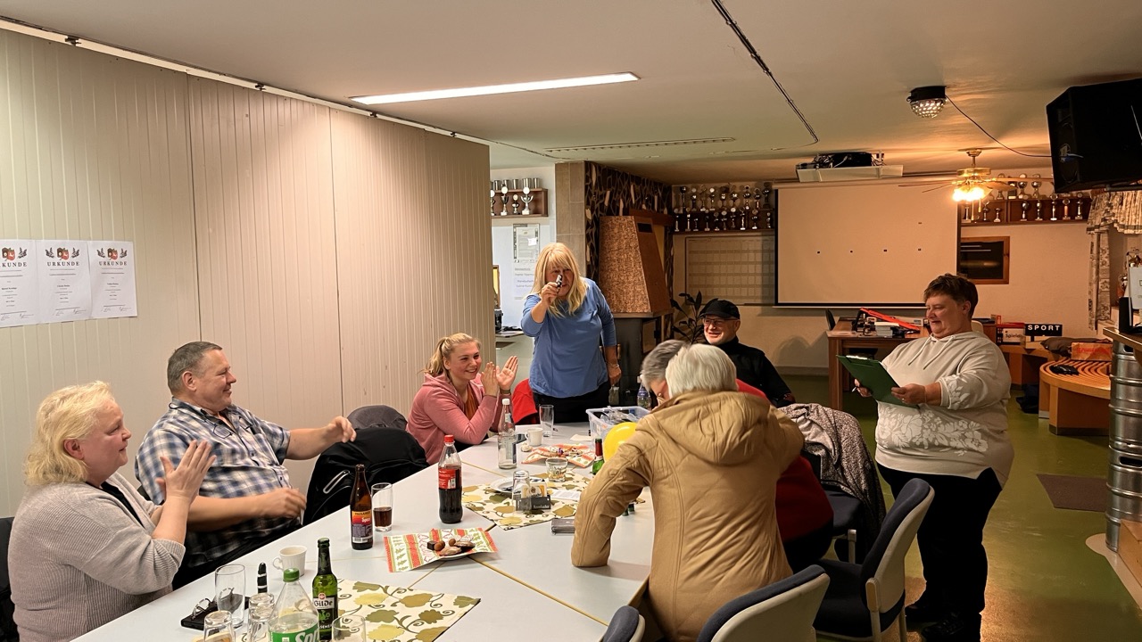 Die Gesamtsiegerin des Abends wurde Dagmar. Gewonnen hat sie eine Butterfahrt (ein leckeres Stück Butter). Der zweite Platz ging an Christa - eine Ballonfahrt (Luftballon mit Lippenpflege). Dritte wurde Sarah, sie gewann ein Essen für zwei Personen (Tütensuppe) und der vierte Platz ging an Uwe - eine Wellness-Behandlung (Gesichtsmaske). Alle anderen haben eine kleine Süßigkeit gewonnen, es ist also niemand leer ausgegangen.